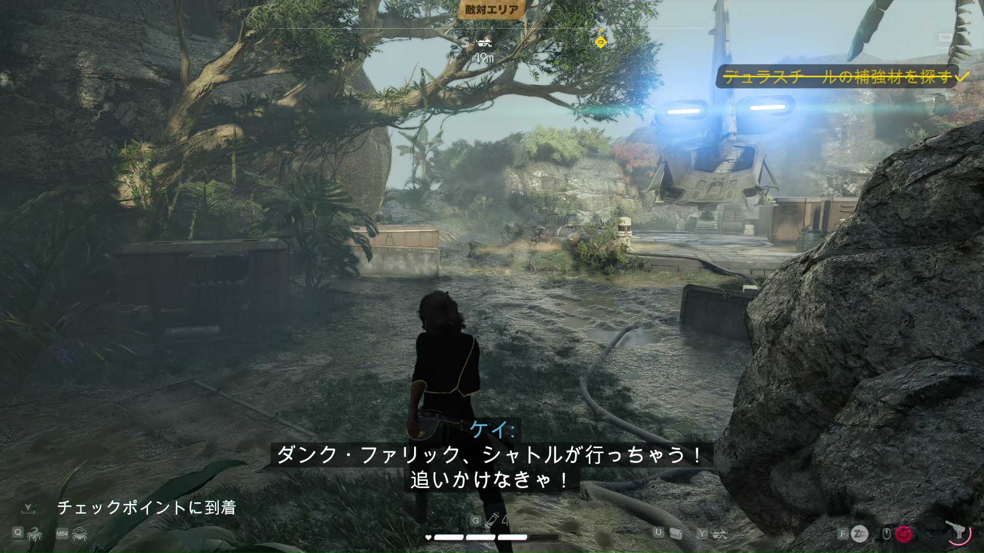 見張りを倒し、奥に進むと補強材を積んだシャトルが飛び立つのを目撃。