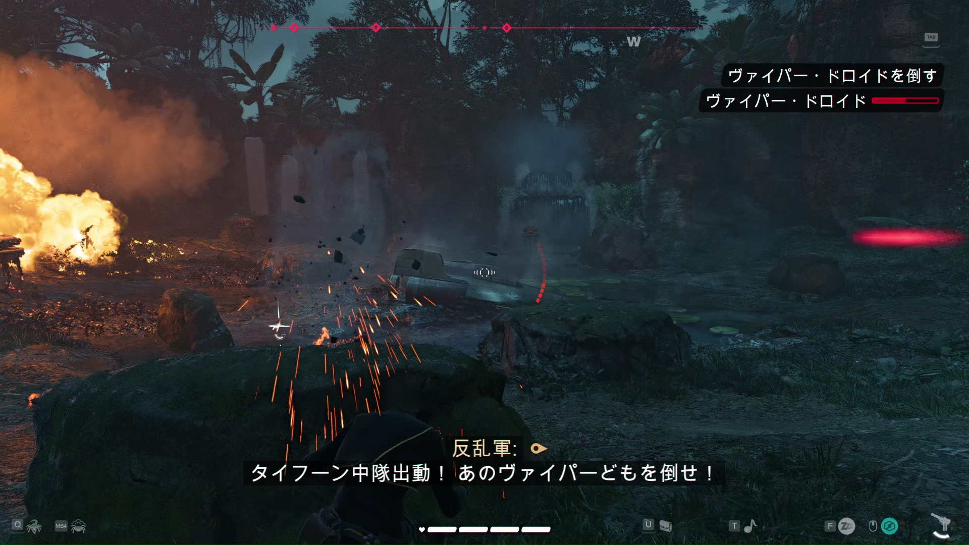 一瞬、援護なのかこちらを狙っている別の襲撃者なのか分からなかった。ブラスターの赤い線がこっちに飛んできてるように見えるので。