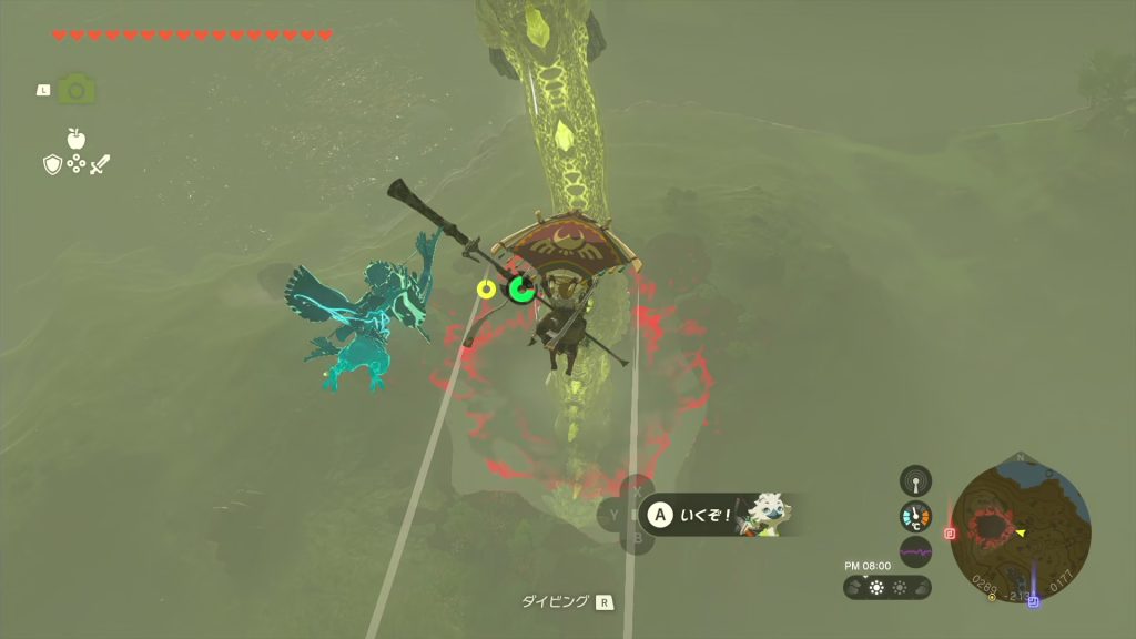 井戸に寄ったりしながらうろつくが、良い感じに空に向かう方法がない。仕方ないから始まりの空島から飛んでみる。