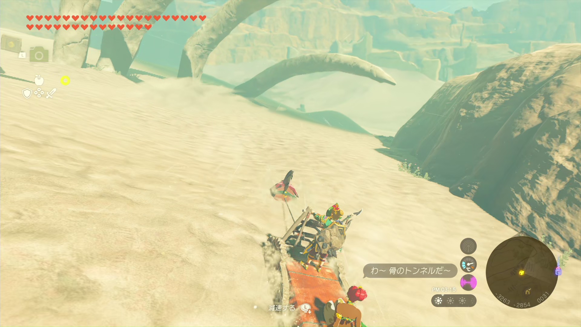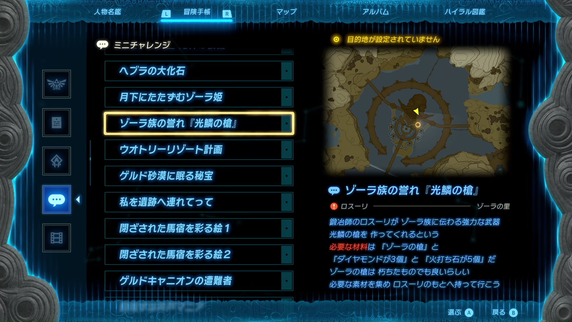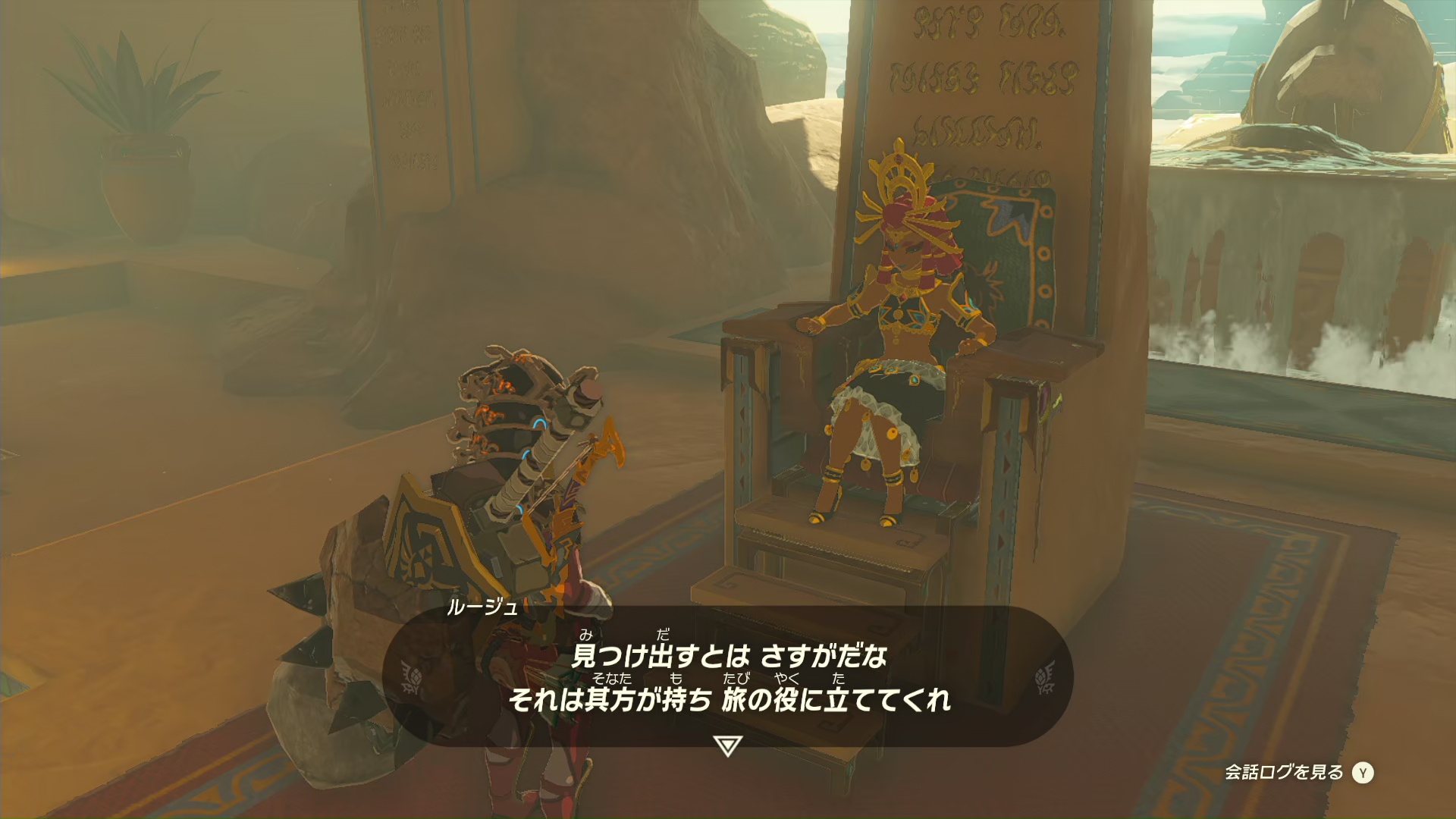 学者をソリザラシで遺跡に連れて行ったり、南オアシス訓練場に行ったり、ゲルドの秘宝を取ったりなどする。