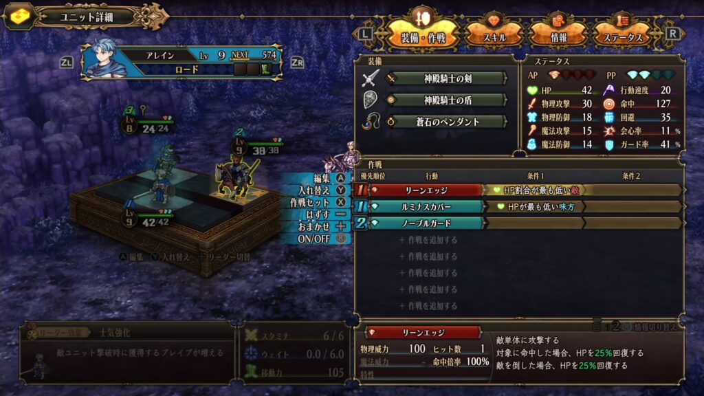 ユニット内での仲間同士の組み合わせ方をあれこれ考えて配置し、各メンバーの戦闘時の行動を条件指定で最適化する。